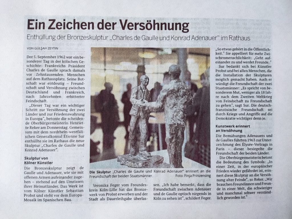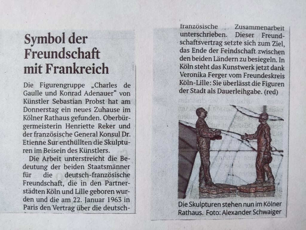 Am 2. Oktober 2025 wurde im Spanischen Bau des Kölner Rathauses eine Bronzeskulptur enthüllt. Sie zeigt Konrad Adenauer und Charles de Gaulle, wie sie aufeinander zugehen. Der FKL ist sehr erfreut darüber, dass für dieses Kunstwerk des Bildhauers Sebastian Probst ein so schöner Platz gefunden wurde. Adenauer wurde in Köln geboren. De Gaulle kam in Lille zur Welt. In den Partnerstädten wuchsen zwei Männer auf, die ganz wesentlich zur deutsch-französischen Freundschaft und zum Frieden in Europa beigetragen haben.