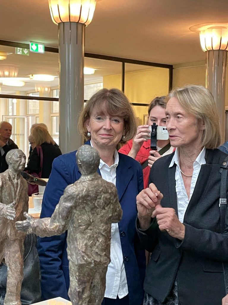 Die Oberbürgermeisterin Frau Henriette Reker (links) und Frau Bettina Adenauer (rechts), eine Enkelin Konrad Adenauers, bewundern die Bronzen.