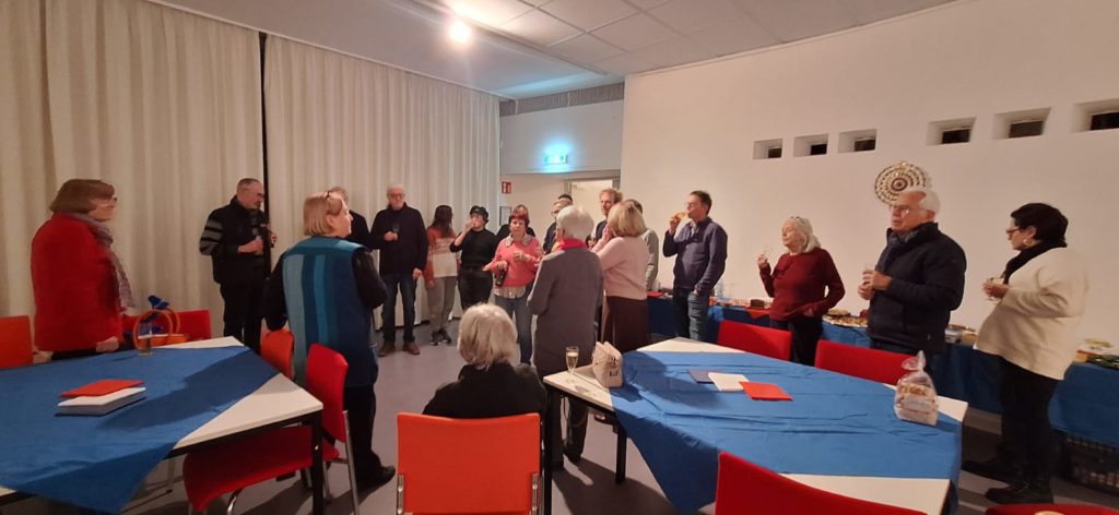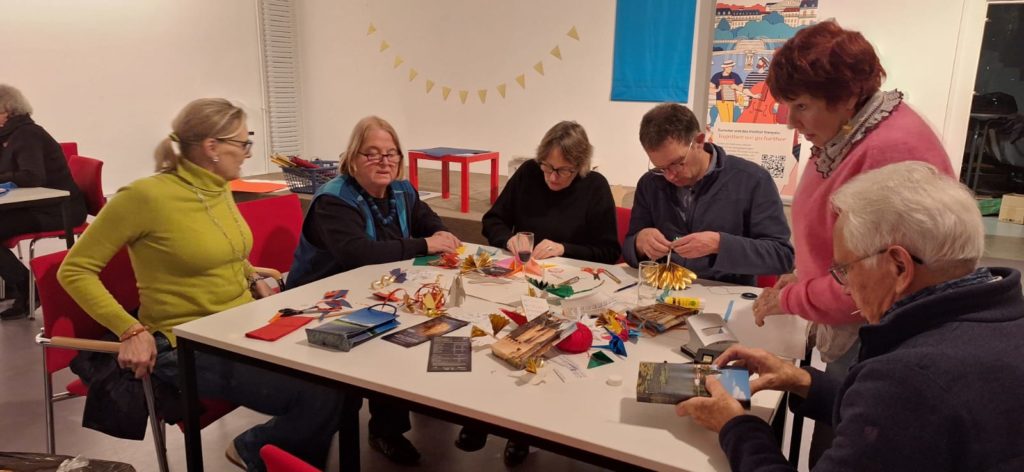 Erster Treffpunkt war das Institut Français, wo die Kölner ihre französischen Gäste in Empfang nahmen. Wir danken dem neuen Leiter des IF, Herrn Sébastien Horzinki, der dies ermöglicht hatte. Neben dem Genuss der mitgebrachten Speisen und den anregenden Gesprächen wurde gemeinsam Christbaumschmuck gebastelt.
