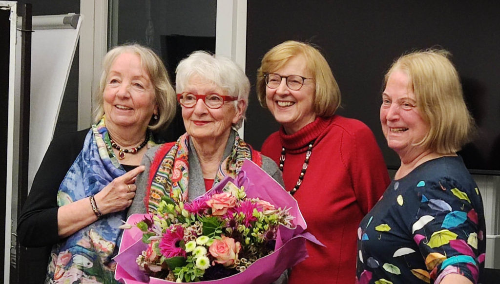 Der Vorstand des FKL von links nach rechts: Anka Helmholz (seit 2025 neu im Vorstand), Christel Rheinisch (lange unsere Vorsitzende, mit Blumen geehrt), Eva Blumrath-Götze und Veronika Ferger (bilden als „co-présidentes“ die Vorsitzenden).